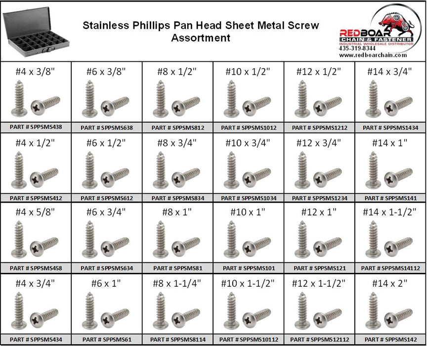 Stainless Phillips Pan Head Sheet Metal Screw Assortment in Metal Locking Tray